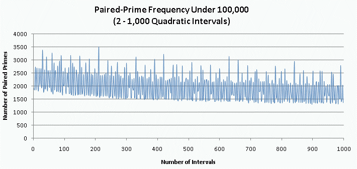 The complete data set of paired primes under 100,000 for the 500 even quadratic intervals up to 1,000, are available for download here.